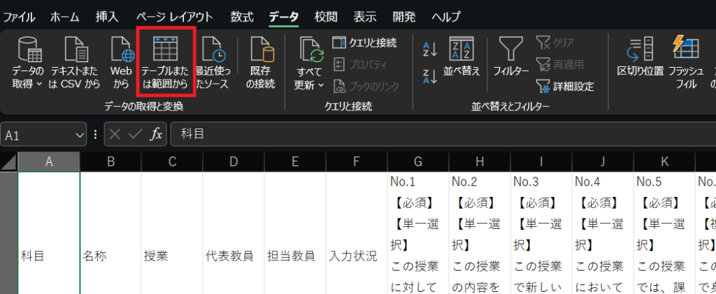 「データ」タブにある「デーブルまたは範囲から」を選択します。