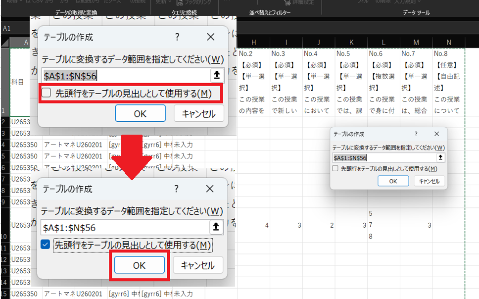 確認ができたら、「□先頭行をテーブルの見出しとして使用する」にチェックを入れ「OK」ボタンを押してください。