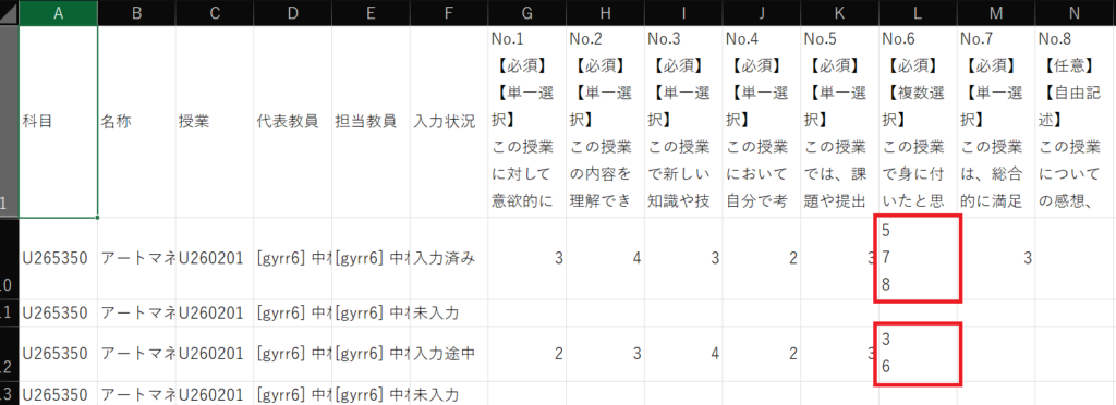 1.授業アンケート結果のcsvファイルをExcelで開きます。