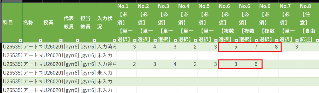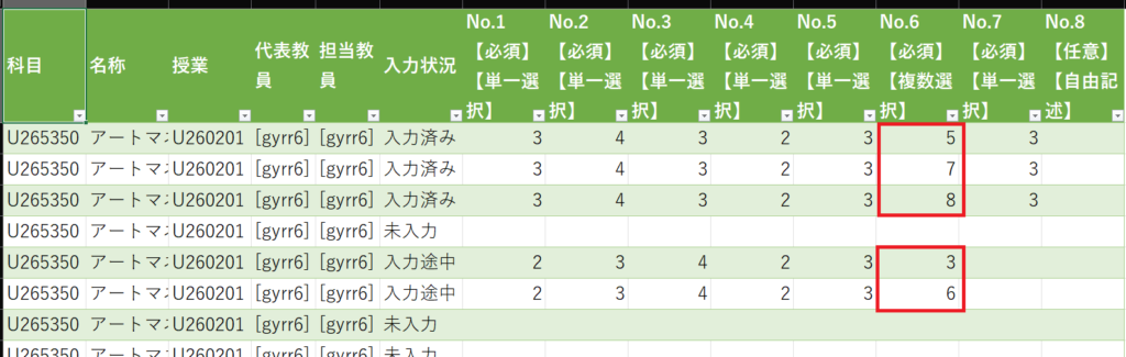 No.6の設問は複数選択のため、1つのセルに回答された全ての選択肢が入っています。