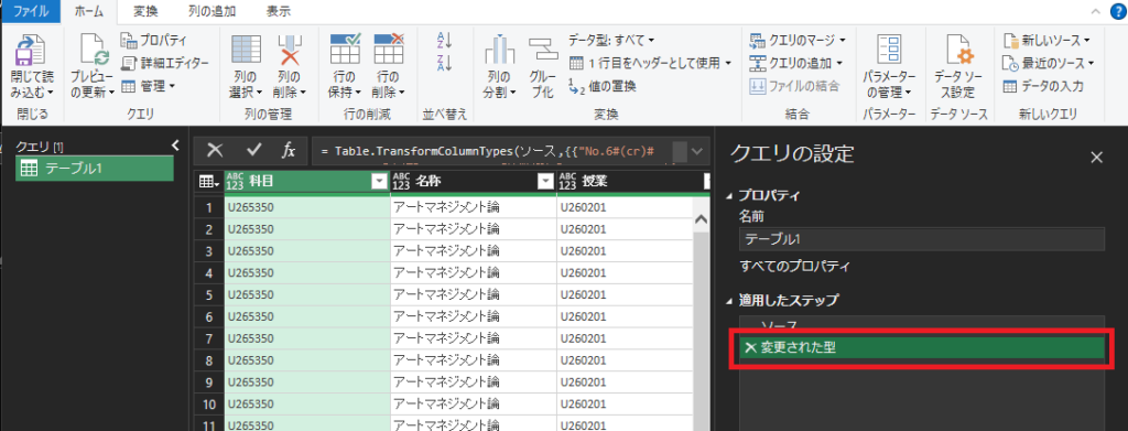 クエリの設定の適用したステップに「変更された型」がある場合は、あらかじめ×で削除し「ソース」のみにしてください。