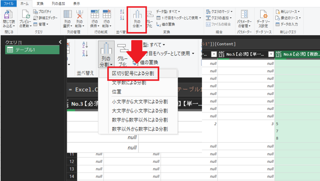 4.セル分割を行いたい列を選択したのち、「ホーム」タブの「列の分割」から「区切り記号による分割」を選択します。
