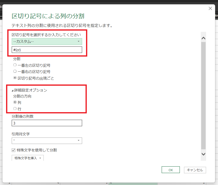 ※「特殊文字を使用して分割」にチェックを入れてください。
