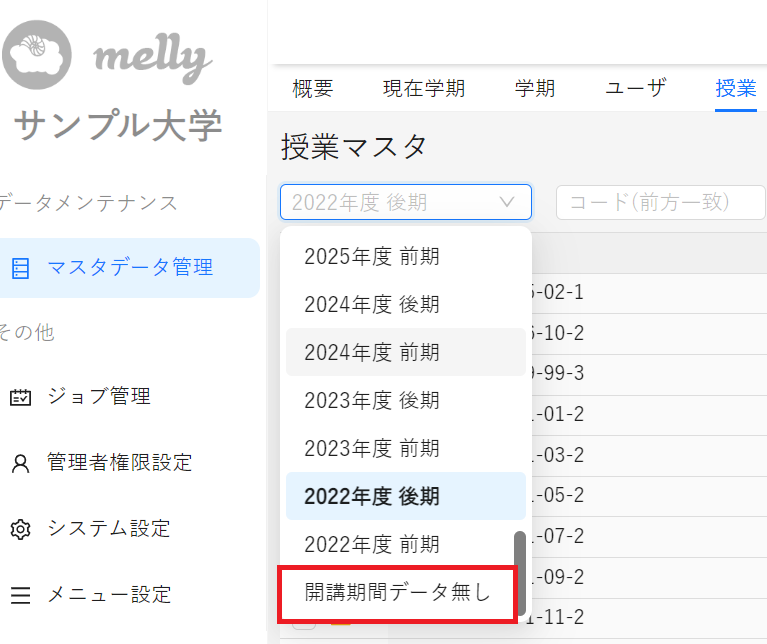授業開講期間が設定されていない場合は、授業マスタの検索欄にある開講期間リストで「開講機関データ無し」に切り替えて検索してみさください。