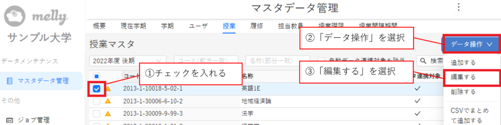 1.授業マスタ画面で色を変更したいグループにチェックを入れて、データ操作の「編集する」を選択